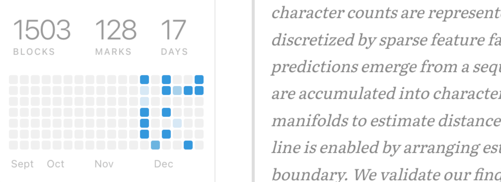 Reedle counts your daily reading blocks and visualize them into a Github-style activity heatmap. In addition to the heatmap and on the top of it, we track and keep your total read blocks, highlights, and every day you've spent with Reedle.